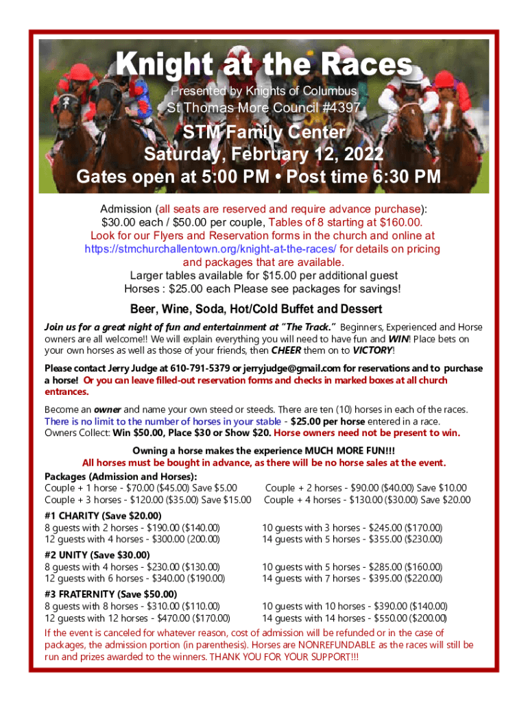 Presented by Knights of Columbus St Thomas More Council #4397STM Family Center Saturday, February 12, 2022, Gates open at 5:00 PM Post time 6:30 PM Admission (all seats are reserved and require advance