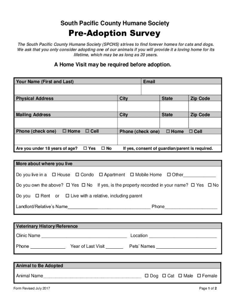 South Pacific County Humane SocietyPreAdoption Survey The South Pacific County Humane Society (SACHS) strives to find forever homes for cats and dogs. May be up to 20 years. We ask that you only consider