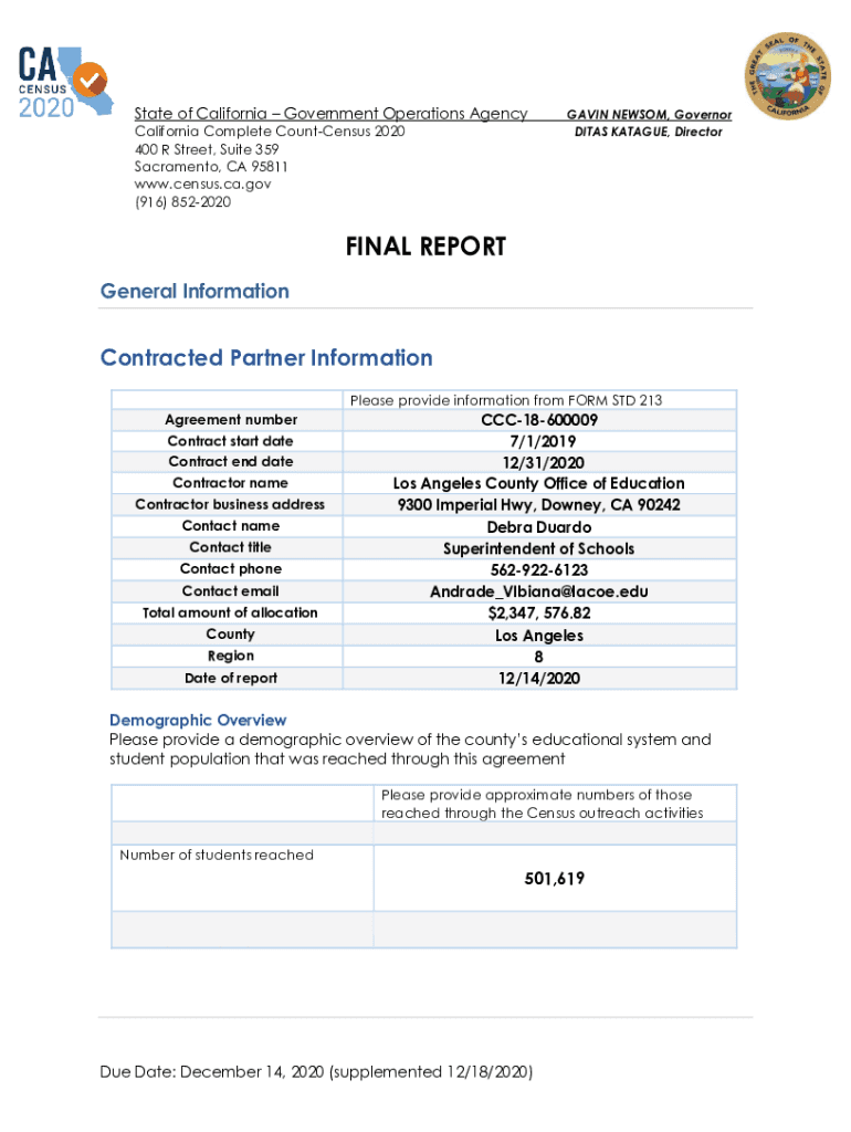 State of California Government Operations AgencyGAVIN NEWSOM, Governor DIAS FATIGUE, Director California Complete Consensus 2020 400 R Street, Suite 359 Sacramento, CA 95811 www.census.ca.gov (916)
