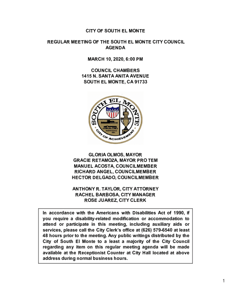 CITY OF SOUTH EL MONTE REGULAR MEETING OF THE SOUTH EL MONTE CITY COUNCIL AGENDA MARCH 10, 2020, 6:00 PM COUNCIL CHAMBERS 1415 N. SANTA ANITA AVENUE SOUTH EL MONTE, CA 91733GLORIA ALMOST, MAYOR GRACIE