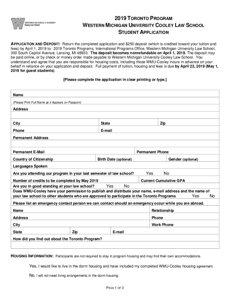 2019 TORONTO PROGRAM WESTERN MICHIGAN UNIVERSITY COOLEY LAW SCHOOL STUDENT APPLICATION AND DEPOSIT: Return the completed application and $250 deposits (which is credited toward your tuition and fees)