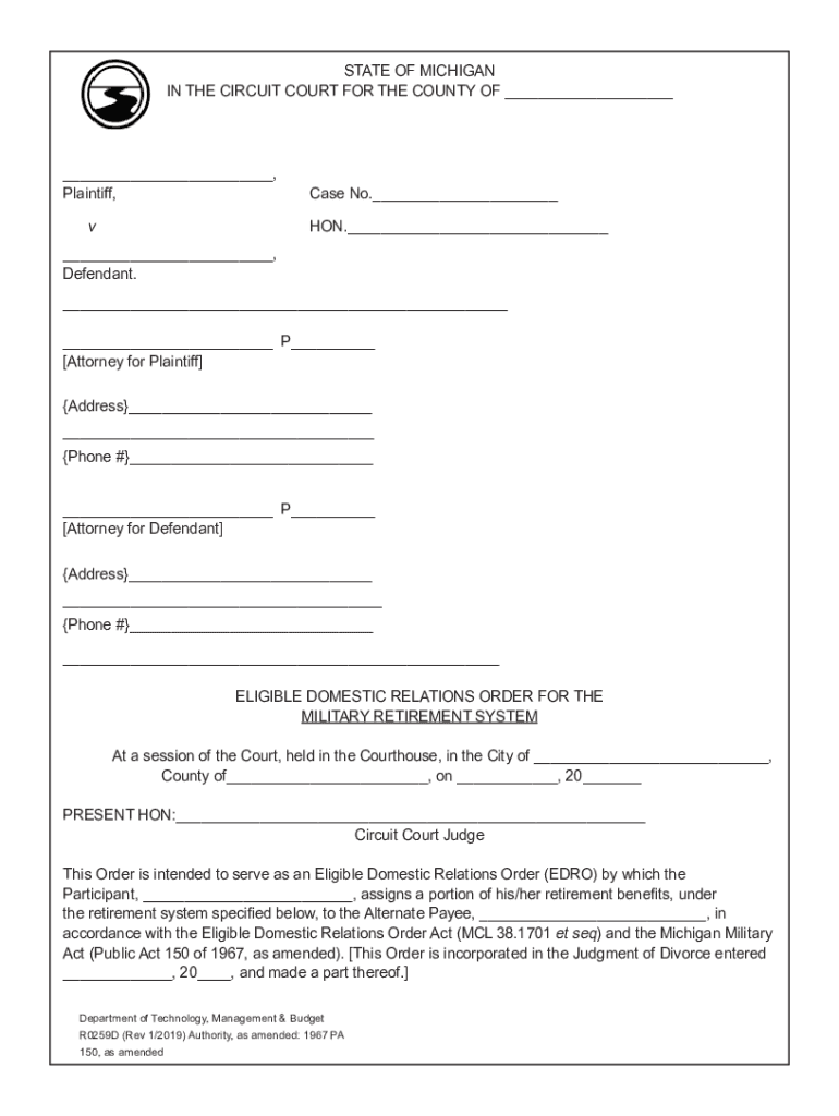 Get the free Eligible Domestic Relations Order (EDRO) (R0259D). Eligible Domestic Relations Order...