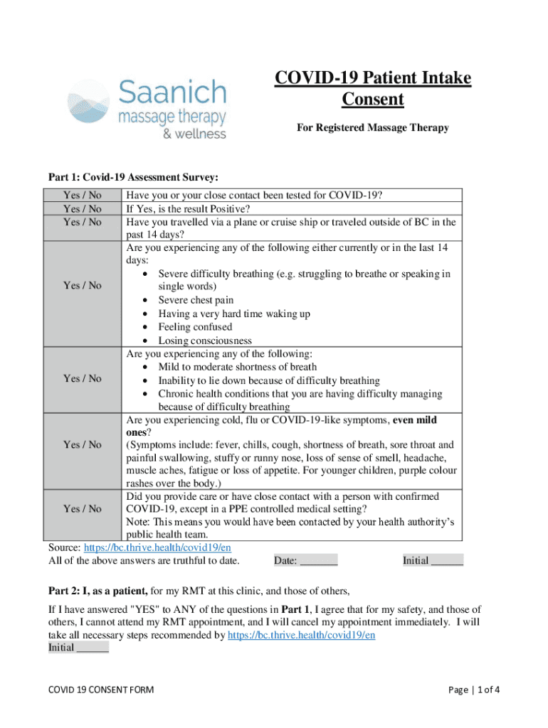 COVID-19 Patient Intake Consent For Registered Massage TherapyPart 1: COVID-19 Assessment Survey: Yes / No Yes / No Yes / Mohave you or your close contact been tested for COVID-19? If Yes, is the
