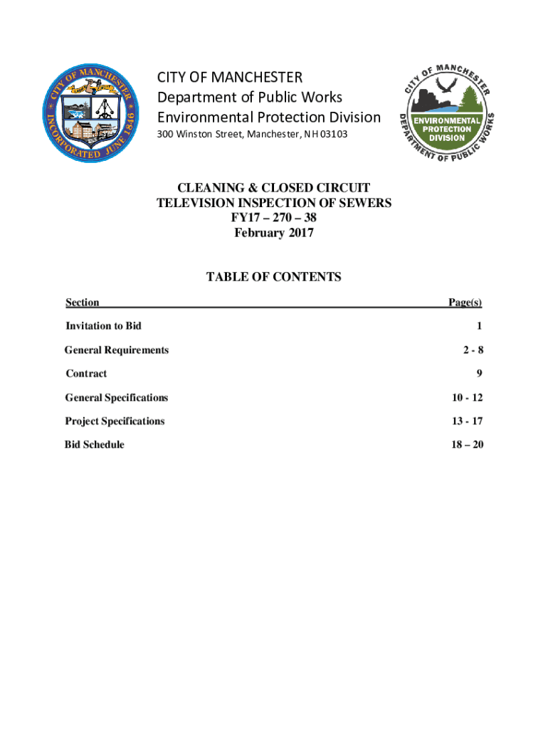 CITY OF MANCHESTER Department of Public Works Environmental Protection Division 300 Winston Street, Manchester, NH 03103CLEANING & CLOSED CIRCUIT TELEVISION INSPECTION OF SEWERS FY17 270 38 February
