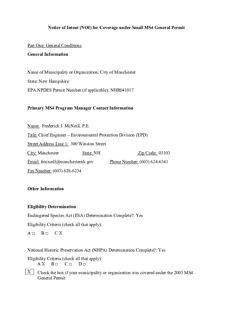 Notice of Intent (NOI) for Coverage under Small MS4 General PermitPart One: General Conditions General Informational of Municipality or Organization: City of Manchester State: New Hampshire EPA NODES