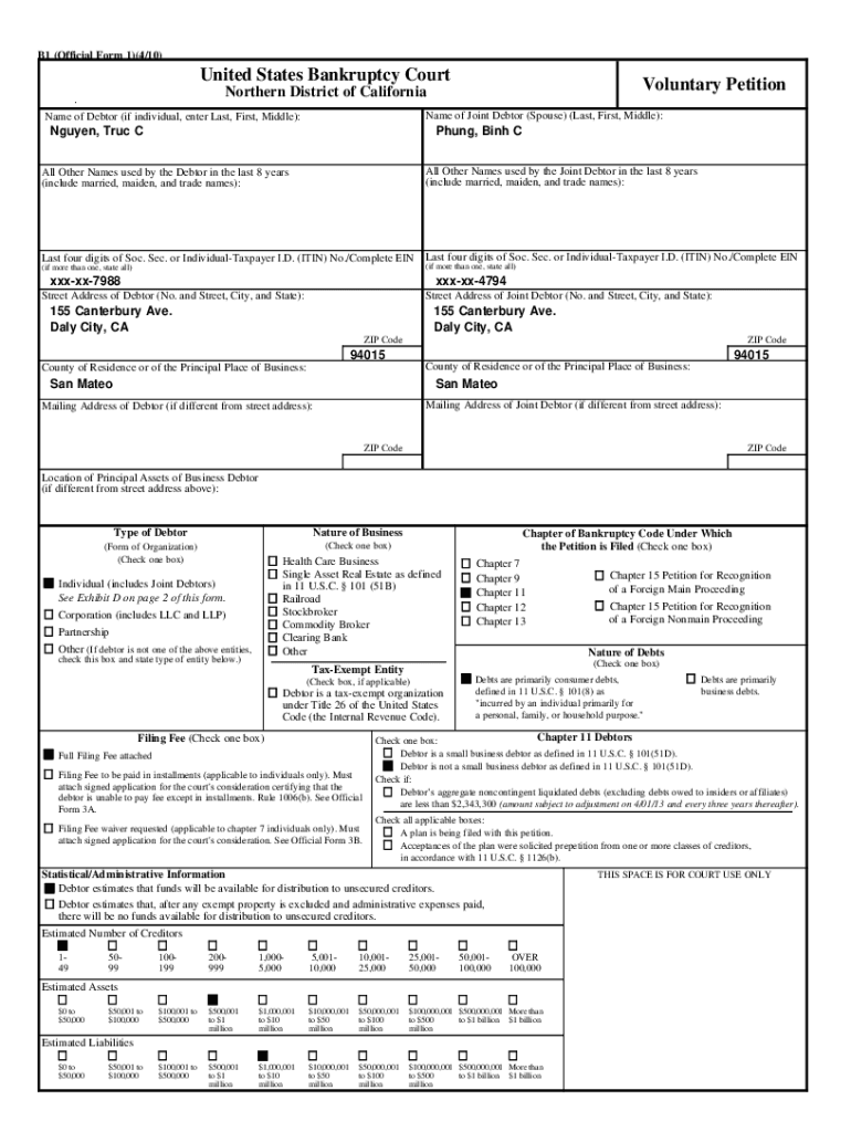 B1 (Official Form 1)(4/10)United States Bankruptcy CourtVoluntary PetitionNorthern District of California b k 1 F o r m. V l u n t a y P e name of Joint Debtor (Spouse) (Last, First, Middle):Name
