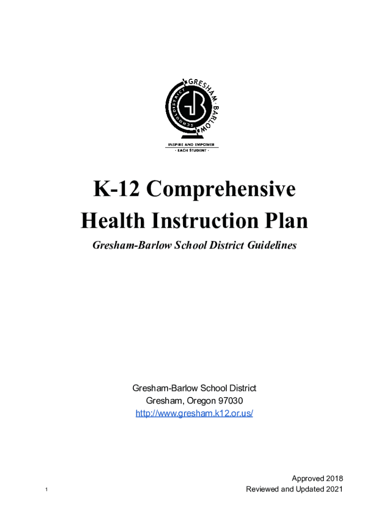 K12 Comprehensive Health Instruction Plan Gresham Barlow School District GuidelinesGreshamBarlow School District Gresham, Oregon 97030 http://www.gresham.k12.or.us/1Approved 2018 Reviewed and Updated