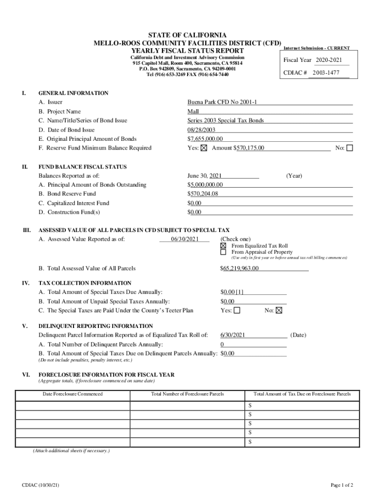 STATE OF CALIFORNIA MELLOWS COMMUNITY FACILITIES DISTRICT (CFD) YEARLY FISCAL STATUS REPORTFiscal Year 20202021California Debt and Investment Advisory Commission 915 Capitol Mall, Room 400, Sacramento,