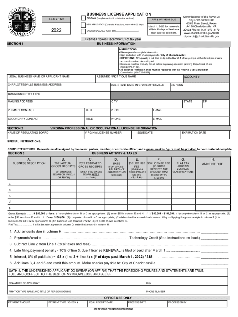 BUSINESS LICENSE APPLICATION TAX YEARRENEWAL (complete section 3, update other sections) NEW APPLICATION (Complete all sections, return within 30 days)2022Commissioner of the Revenue City of Charlottesville