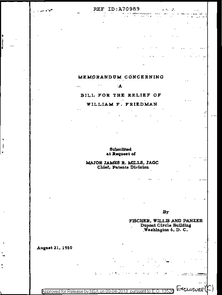 . ....REF ID:A70989. \'\'., L ..... I..........::.\”\”:.......:. Memorandum CONCERNING BILL FOR THE RELIEF OF WILLIAM F. FRIEDMANSubmitted, .at R×equal of MAJ\'OR J\'AMES R. MILLS, J\'AGC Chief,