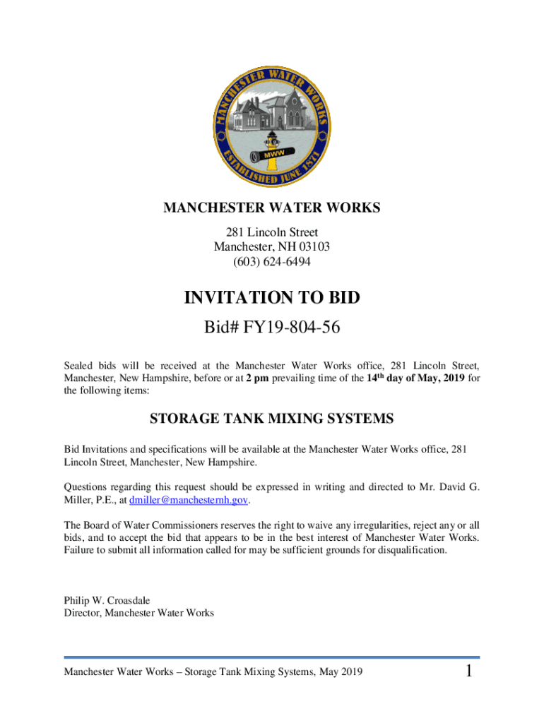 MANCHESTER WATER WORKS 281 Lincoln Street Manchester, NH 03103 (603) 6246494INVITATION TO BID# FY1980456 Sealed bids will be received at the Manchester Water Works office, 281 Lincoln Street, Manchester,