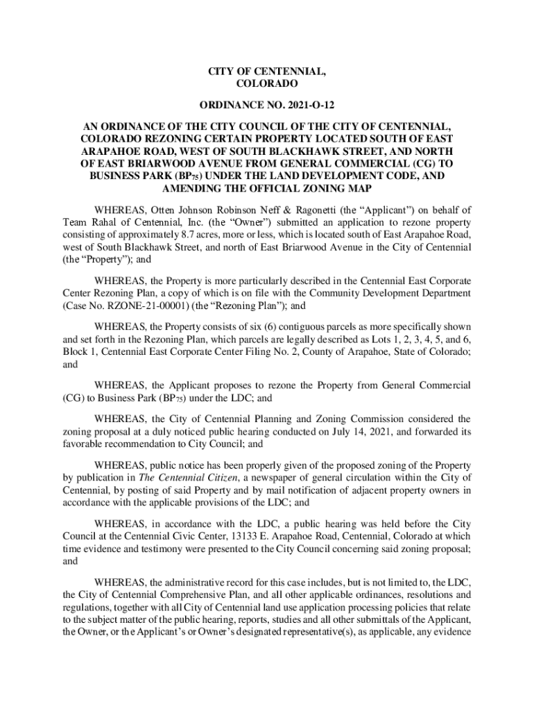 CITY OF CENTENNIAL, COLORADO ORDINANCE NO. 2021O12 AN ORDINANCE OF THE CITY COUNCIL OF THE CITY OF CENTENNIAL, COLORADO REZONING CERTAIN PROPERTY LOCATED SOUTH OF EAST ARAPAHOE ROAD, WEST OF SOUTH