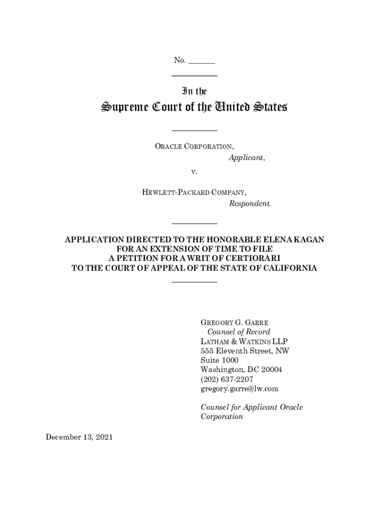 No. ___In supreme Court of the United States ORACLE CORPORATION, Applicant, v. Hewlett Packard COMPANY, Respondent. APPLICATION DIRECTED TO THE HONORABLE ELENA KAGAN FOR AN EXTENSION OF TIME TO FILE