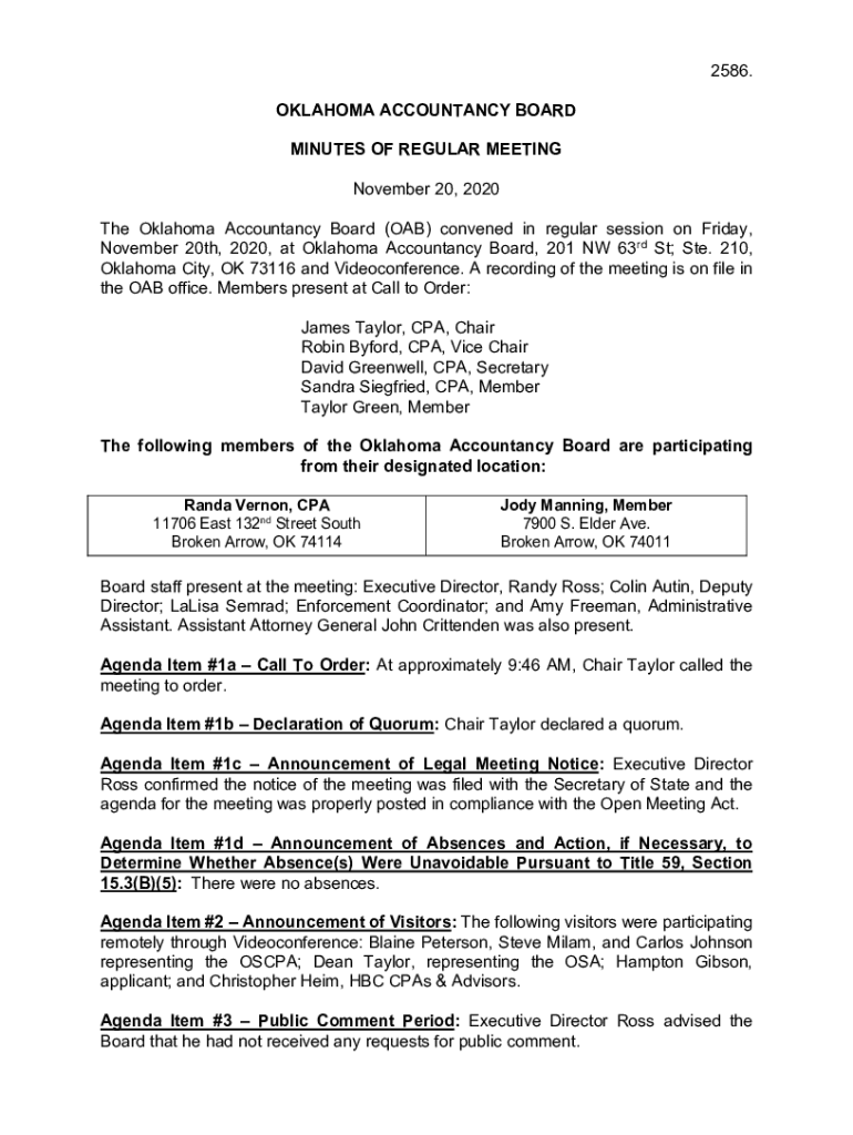 Get the free November 20th, 2020, at Oklahoma Accountancy Board, 201 NW 63rd St; Ste