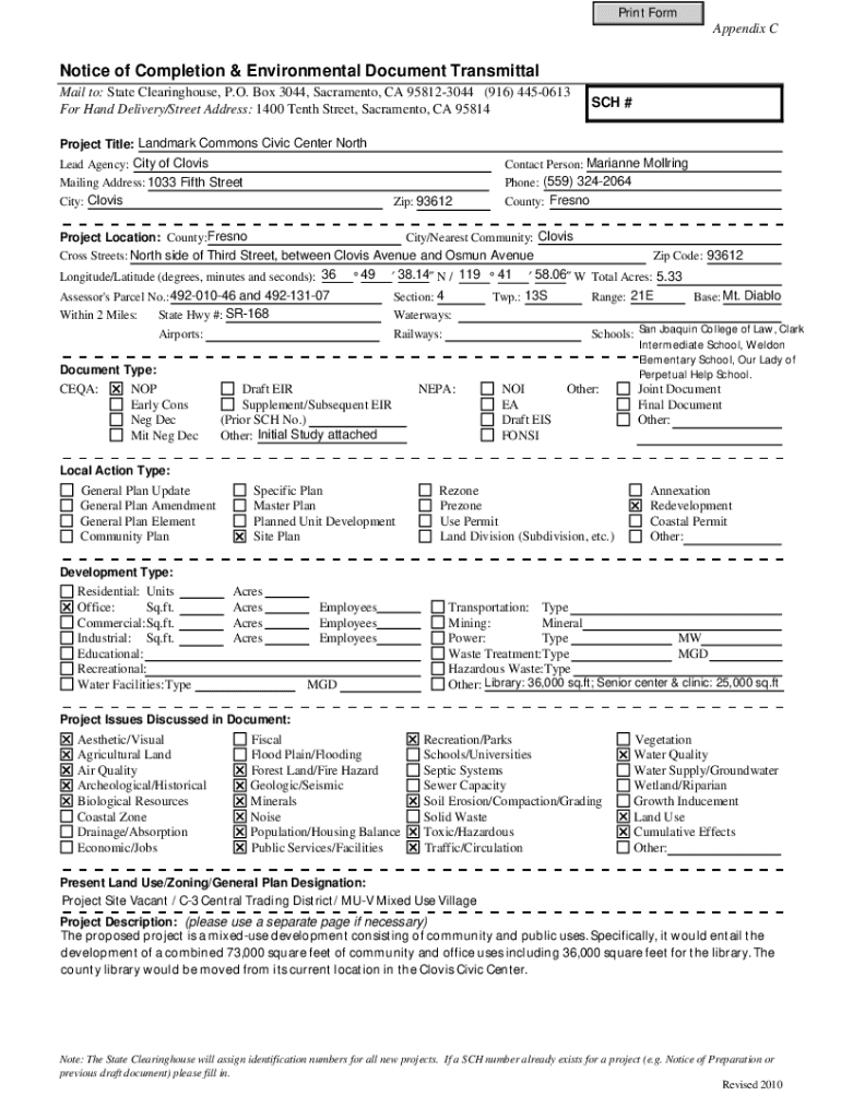 Print Form Appendix Notice of Completion & Environmental Document Transmittal Mail to: State Clearinghouse, P.O. Box 3044, Sacramento, CA 958123044 (916) 4450613 For Hand Delivery/Street Address:
