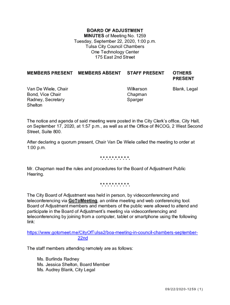 BOARD OF ADJUSTMENT MINUTES of Meeting No. 1259 Tuesday, September 22, 2020, 1:00 p.m. Tulsa City Council Chambers One Technology Center 175 East 2nd Street MEMBERS PRESENTMEMBERS ABSENT Van De Wiele,