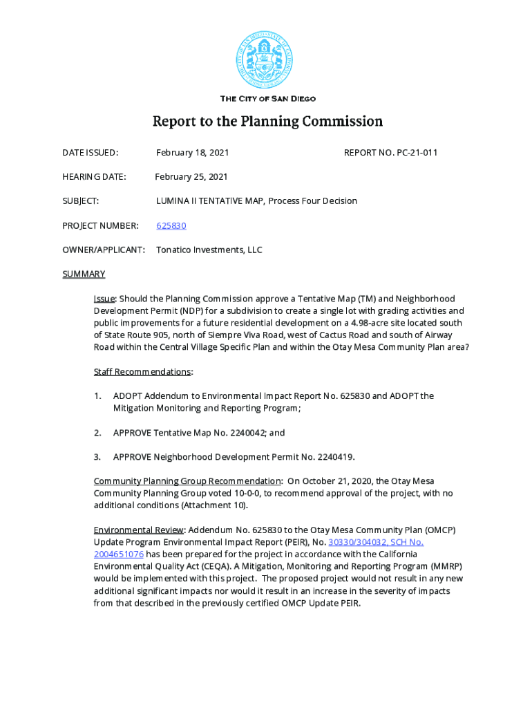 THE CITY OF SAN DIEGOReport to the Planning Commission DATE ISSUED:February 18, 2021REPORT NO. PC21011HEARING DATE:February 25, 2021SUBJECT:ALUMINA II TENTATIVE MAP, Process Four DecisionPROJECT NUMBER:625830OWNER/APPLICANT:Donation