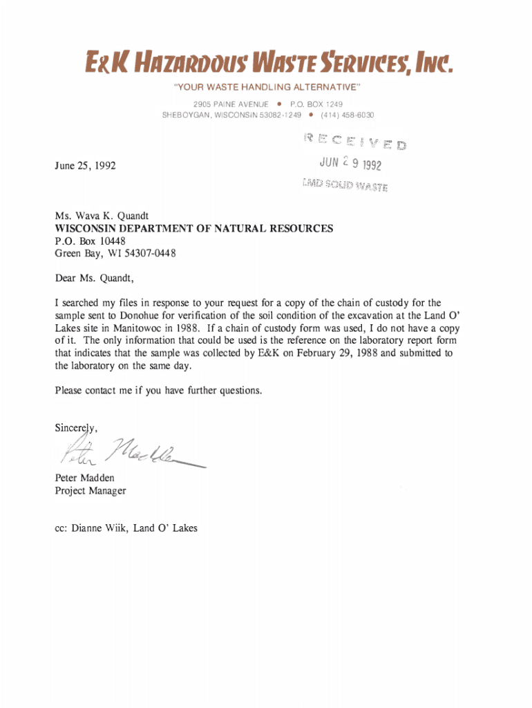 Ell lllllllllOOUf Wolfe fEilllltEf, Int. \” YOUR WASTE HANDLING ALTERNATIVE\” 2905 PAINEAVENUEP 0 BOX 1249SHEBOYGAN, WISCONSIN 530821249June(414) 4586030JUN 2 9 199225, 1992Ms. Wave K. QuandtWISCONSIN