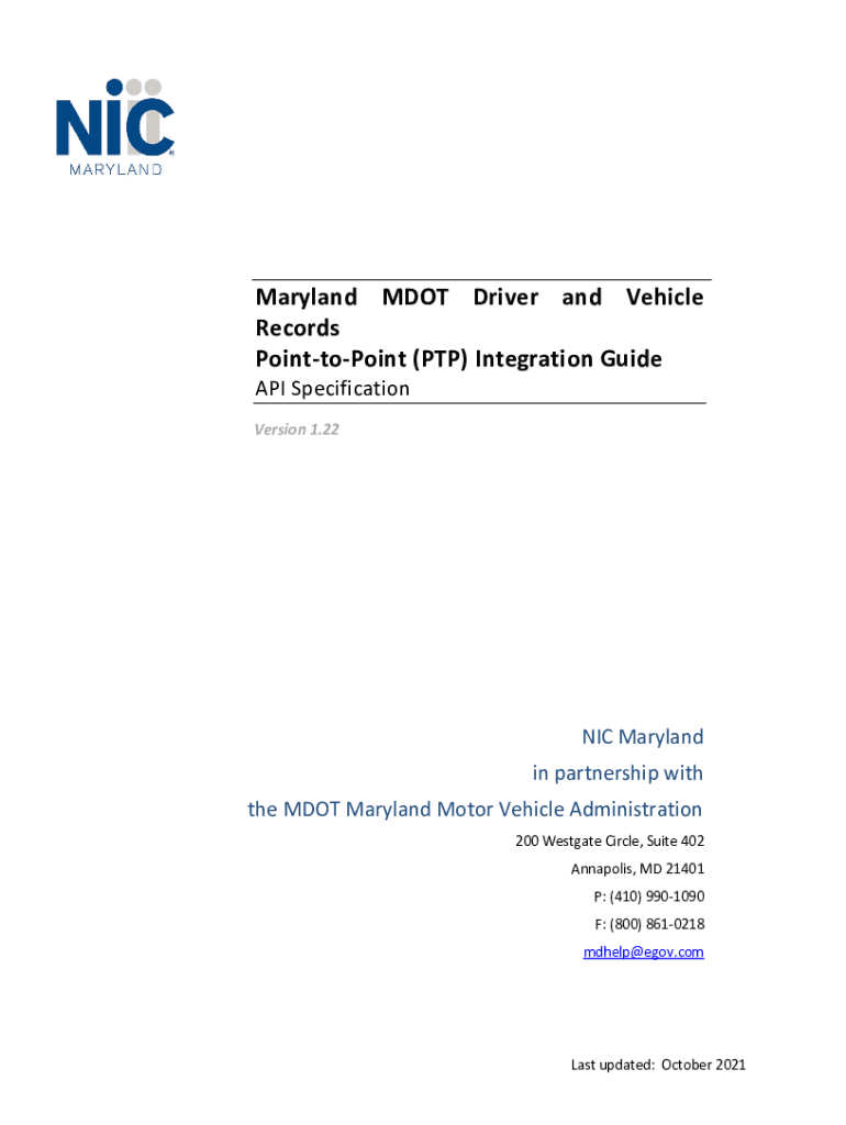 Maryland DOT Driver and Vehicle Records PointtoPoint (PTP) Integration Guide API Specification Version 1.22NIC Maryland in partnership with the DOT Maryland Motor Vehicle Administration 200 West gate