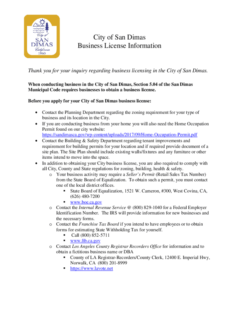 City of San Dimas Business License InformationThank you for your inquiry regarding business licensing in the City of San Dimas. When conducting business in the City of San Dimas, Section 5.04 of the