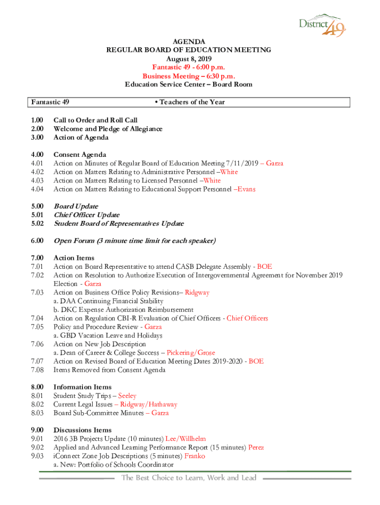 AGENDA REGULAR BOARD OF EDUCATION MEETING August 8, 2019, Fantastic 49 6:00 p.m. Business Meeting 6:30 p.m. Education Service Center Board Room Fantastic 49 Teachers of the Year1.00 2.00 3.00Call