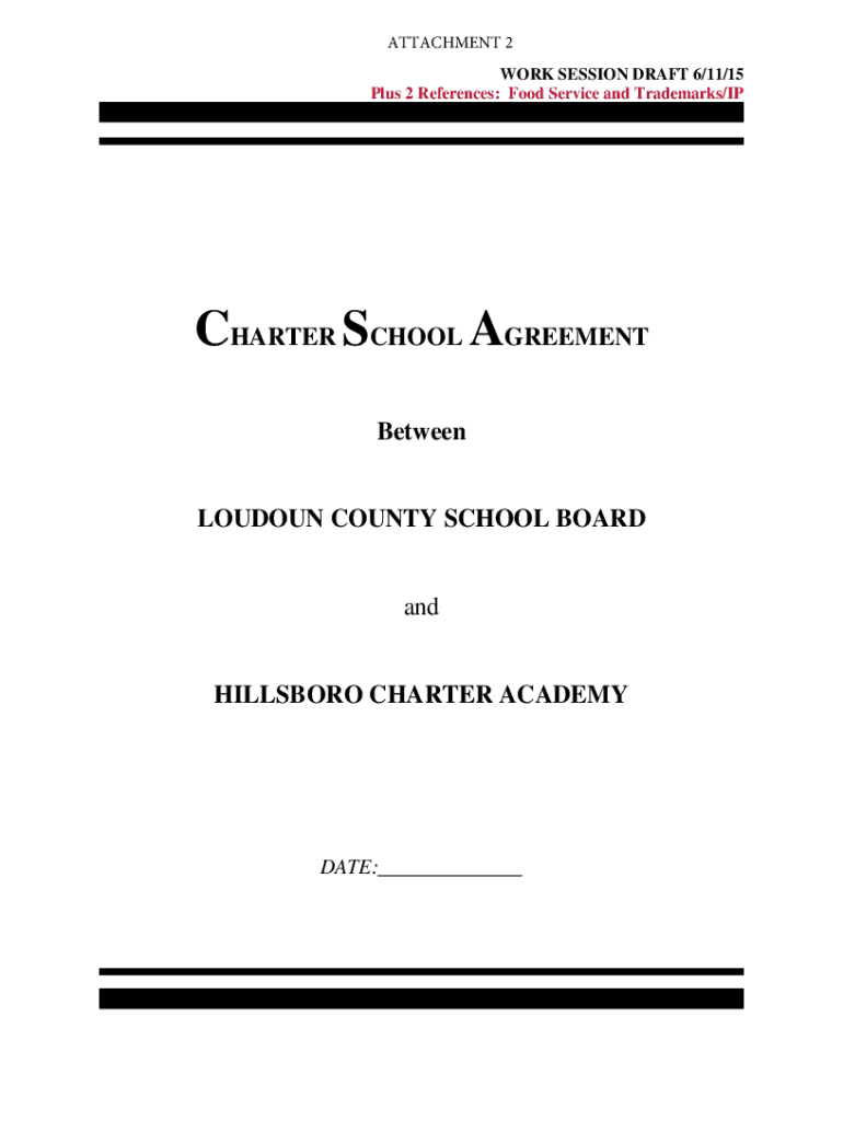 ATTACHMENT 2 WORK SESSION DRAFT 6/11/15 Plus 2 References: Food Service and Trademarks/CHARTER SCHOOL AGREEMENT BetweenLOUDOUN COUNTY SCHOOL BOARDandHILLSBORO CHARTER ACADEMYDATE:___Loudoun County