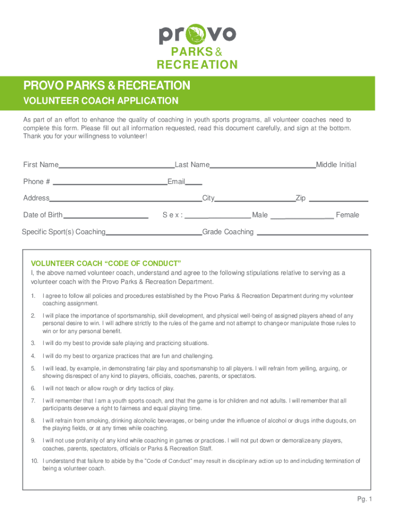 PARKS & RECCE ATI PROVO PARKS & RECREATION VOLUNTEER COACH APPLICATION As part of an effort to enhance the quality of coaching in youth sports programs, all volunteer coaches need to complete this