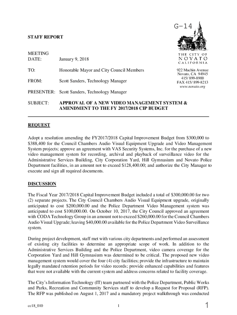 G14 STAFF REPORTMEETING DATE:January 9, 2018TO:Honorable Mayor and City Council MembersFROM:Scott Sanders, Technology Manager922 Machine Avenue Novato, CA 94945 415/ 8998900 FAX 415/ 8998213 www.novato.orgPRESENTER: