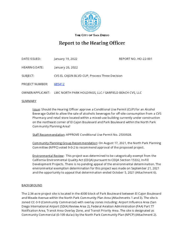 DATE ISSUED:January 19, 2022REPORT NO. HO22001HEARING DATE:January 26, 2022SUBJECT:CVS EL CAJON BLVD CUP, Process Three DecisionPROJECT NUMBER:685412OWNER/APPLICANT:LMC NORTH PARK HOLDINGS, LLC /