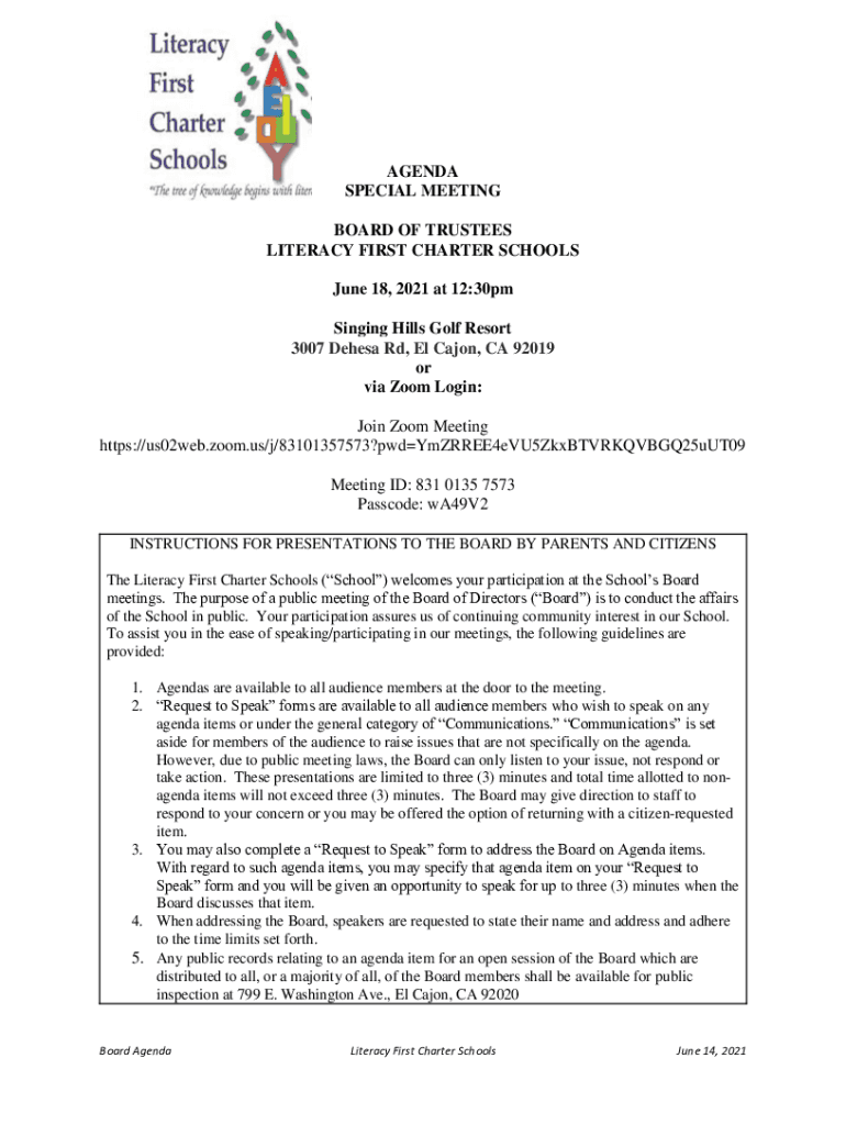 AGENDA SPECIAL MEETING BOARD OF TRUSTEES LITERACY FIRST CHARTER SCHOOLS June 18, 2021, at 12:30pm Singing Hills Golf Resort 3007 Teresa Rd, El Cajon, CA 92019 or via Zoom Login: Join Zoom Meeting