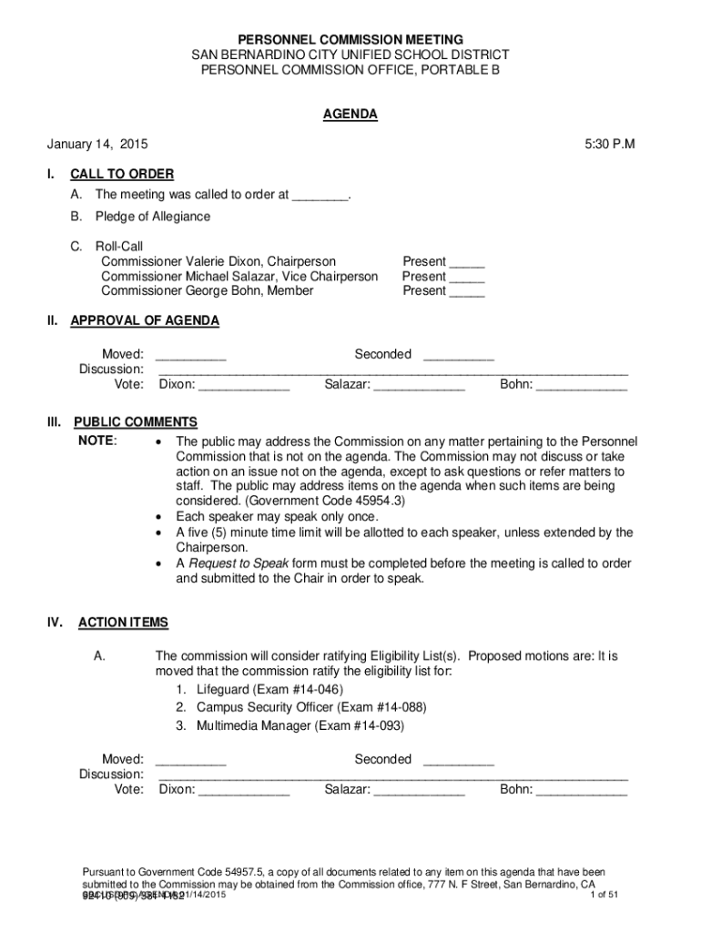PERSONNEL COMMISSION MEETING SAN BERNARDINO CITY UNIFIED SCHOOL DISTRICT PERSONNEL COMMISSION OFFICE, PORTABLE AGENDA January 14, 2015, I.5:30 P.CALL TO ORDER A. The meeting was called to order at