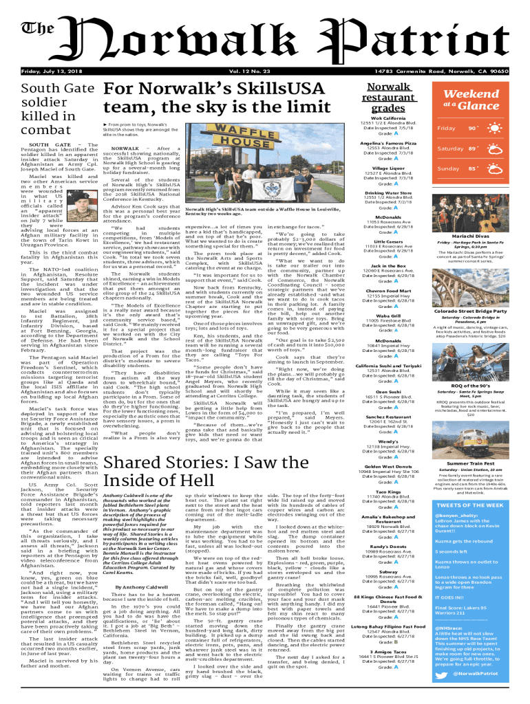 Friday, July 13, 2018Vol. 12 No. 2314783 Armenia Road, Norwalk, CA 90650South Gate soldier killed in combat SOUTH GATE The Pentagon has identified the soldier killed in an apparent insider attack