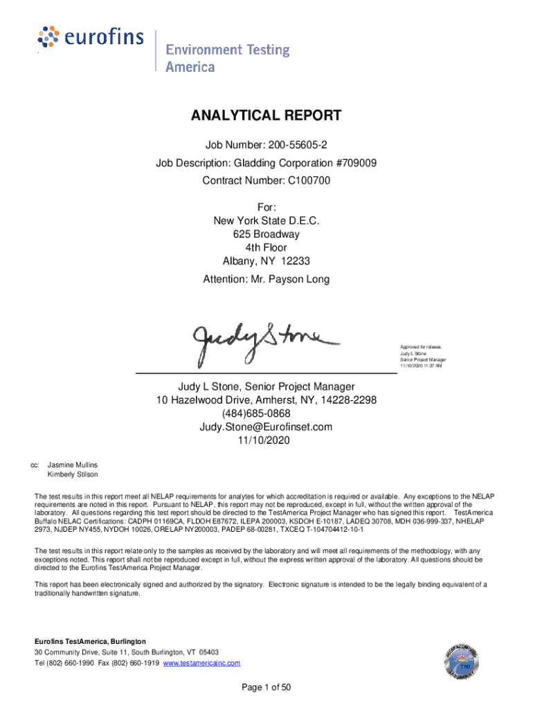 ANALYTICAL REPORT Job Number: 200556052 Job Description: Cladding Corporation #709009 Contract Number: C100700 For: New York State D.E.C. 625 Broadway 4th Floor Albany, NY 12233 Attention: Mr. Payson