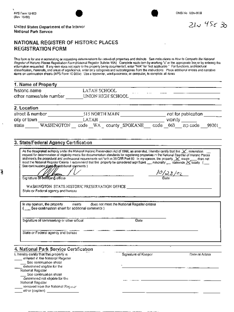 , NI\'S form 10900 (Rev 1090)United States Department National Park Service of the Interior OMS No 10240018NATIONAL REGISTER OF HISTORIC PLACES REGISTRATION FORM This form IS for use In nominating