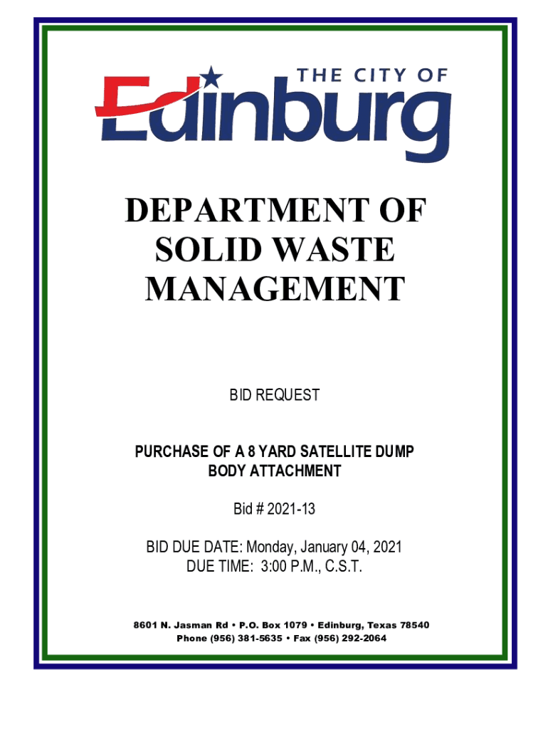 DEPARTMENT OF SOLID WASTE MANAGEMENT BID REQUEST PURCHASE OF A 8 YARD SATELLITE DUMP BODY ATTACHMENT Bid # 202113 BID DUE DATE: Monday, January 04, 2021, DUE TIME: 3:00 P.M., C.S.T.8601 N. Tasman