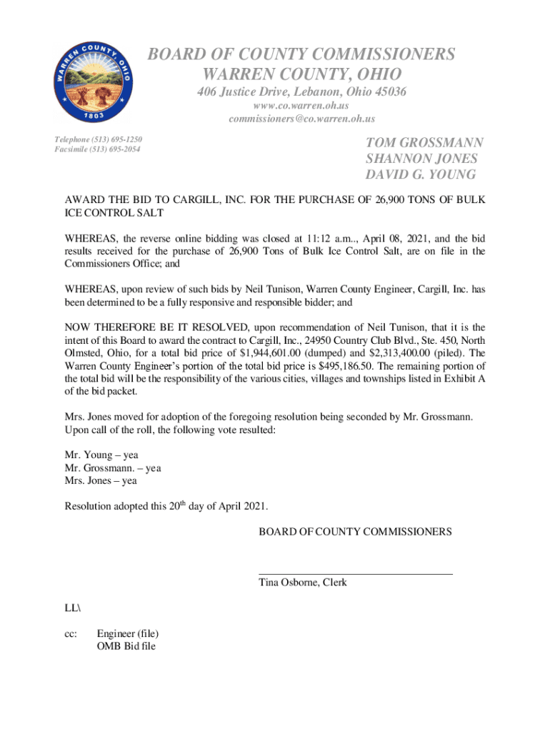 BOARD OF COUNTY COMMISSIONERS WARREN COUNTY, OHIO 406 Justice Drive, Lebanon, Ohio 45036 www.co.warren.oh.us commissioners×co.warren.oh.us Telephone (513) 6951250 Facsimile (513) 6952054TOM GROSSMAN