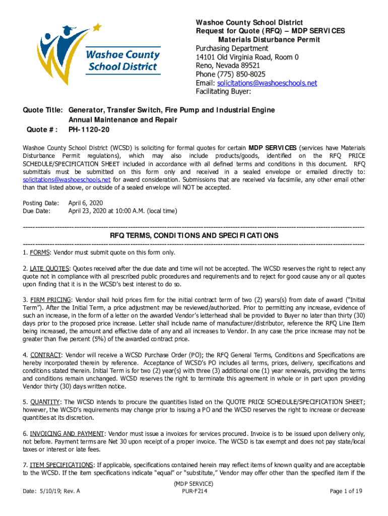 Washoe County School District Request for Quote (RFQ) MDP SERVICES Materials Disturbance Permit Purchasing Department 14101 Old Virginia Road, Room 0 Reno, Nevada 89521 Phone (775) 8508025 Email: