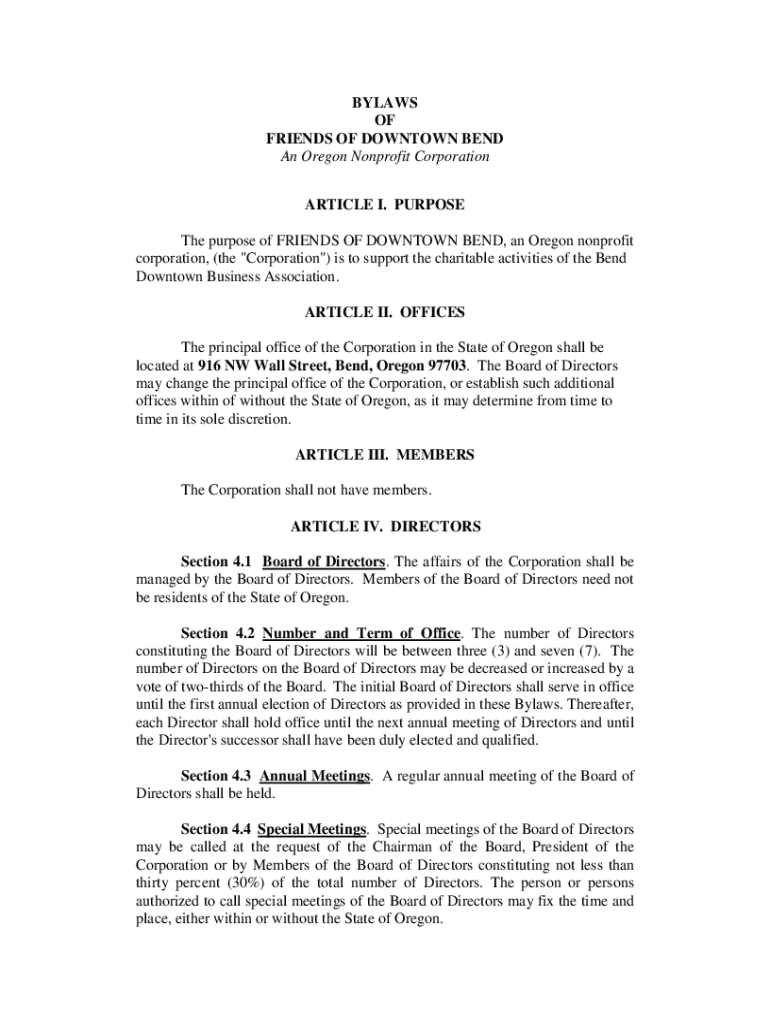 BYLAWS OF FRIENDS OF DOWNTOWN BEND An Oregon Nonprofit Corporation ARTICLE I. PURPOSE The purpose of FRIENDS OF DOWNTOWN BEND, an Oregon nonprofit corporation, (the \” Corporation\”) is to support