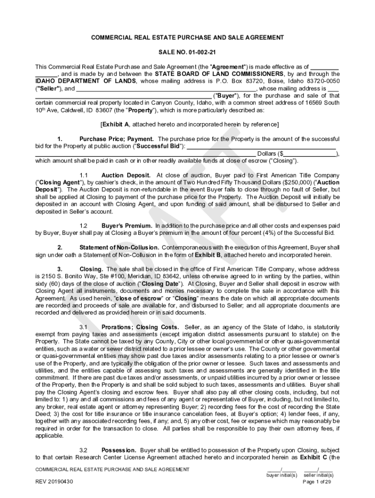 COMMERCIAL REAL ESTATE PURCHASE AND SALE AGREEMENT SALE NO. 0100221 This Commercial Real Estate Purchase and Sale Agreement (the \” Agreement\”) is made effective as of, and is made by and between