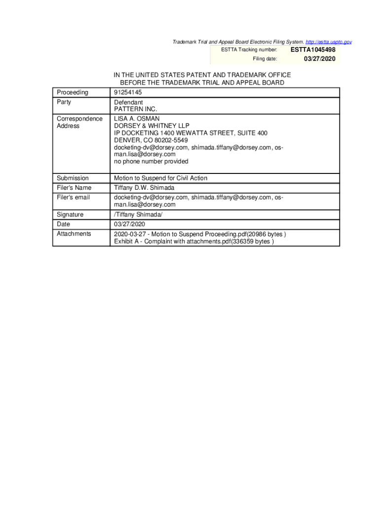 Trademark Trial and Appeal Board Electronic Filing System. http://estta.uspto.gov ETTA Tracking number: Filing date:ProceedingESTTA1045498 03/27/2020IN THE UNITED STATES PATENT AND TRADEMARK OFFICE