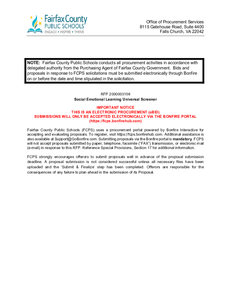 Office of Procurement Services 8115 Gatehouse Road, Suite 4400 Falls Church, VA 22042 NOTE: Fairfax County Public Schools conducts all procurement activities in accordance with delegated authority