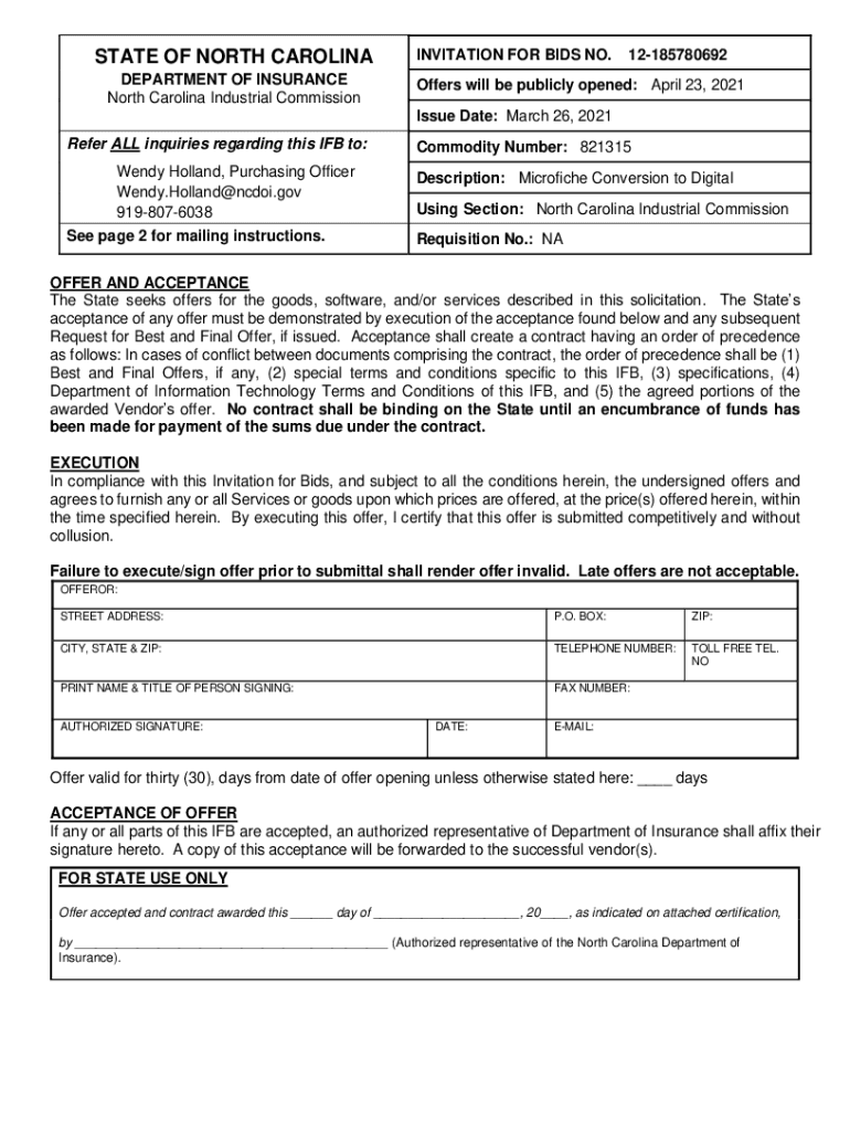 STATE OF NORTH CAROLINA DEPARTMENT OF INSURANCE North Carolina Industrial CommissionINVITATION FOR BIDS NO.12185780692Offers will be publicly opened: April 23, 2021, Issue Date: March 26, 2021Refer