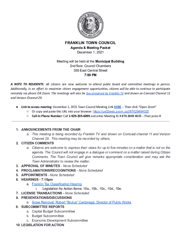 Get the free www.franklinma.govtown-councilagendaFRANKLIN TOWN COUNCIL