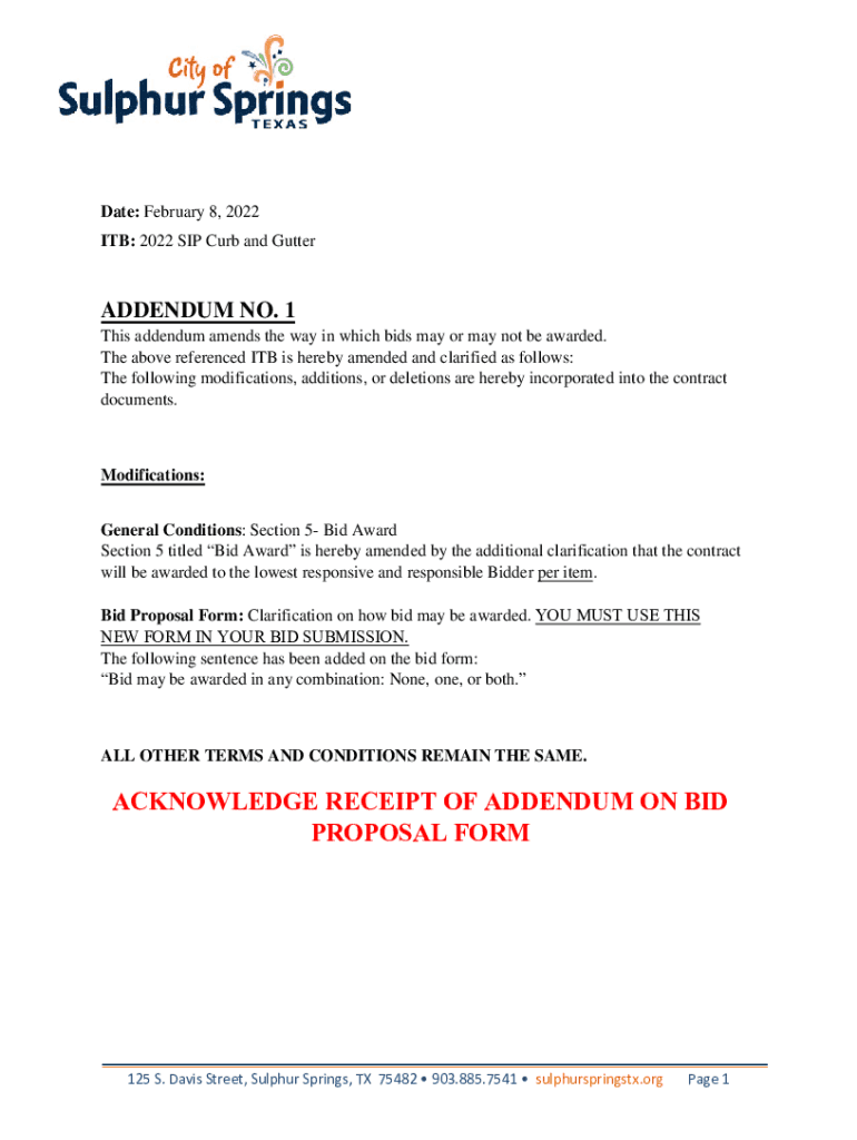 Date: February 8, 2022, ITB: 2022 SIP Curb and GutterADDENDUM NO. 1 This addendum amends the way in which bids may or may not be awarded. The above referenced ITB is hereby amended and clarified as