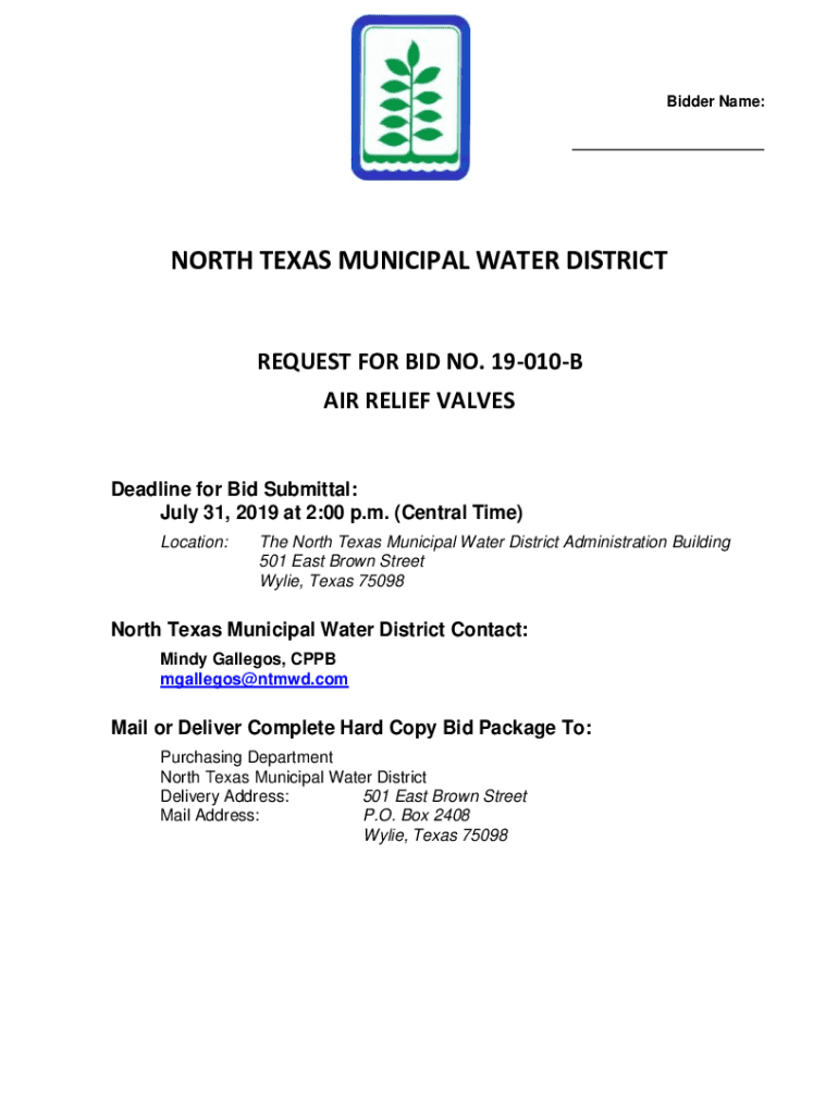 Bidder Name:NORTH TEXAS MUNICIPAL WATER DISTRICTREQUEST FOR BID NO. 19010B AIR RELIEF VALVESDeadline for Bid Submittal: July 31, 2019, at 2:00 p.m. (Central Time) Location:The North Texas Municipal