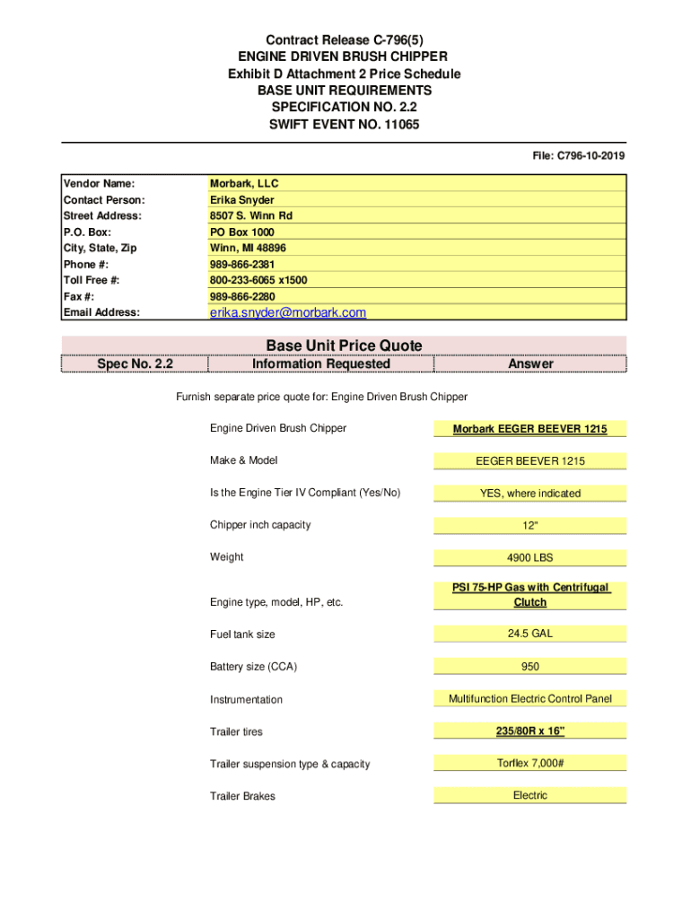 Contract Release C796(5) ENGINE DRIVEN BRUSH CHIPPER Exhibit D Attachment 2 Price Schedule BASE UNIT REQUIREMENTS SPECIFICATION NO. 2.2 SWIFT EVENT NO. 11065 File: C796102019 Vendor Name: Contact