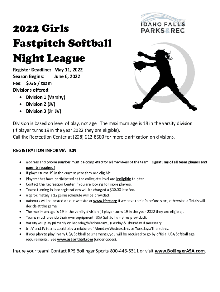 2022 Girls Fast pitch Softball Night League Register Deadline: May 11, 2022, Season Begins: June 6, 2022, Fee: $735 / team Divisions offered: Division 1 (Varsity) Division 2 (JV) Division 3 (Jr. JV)