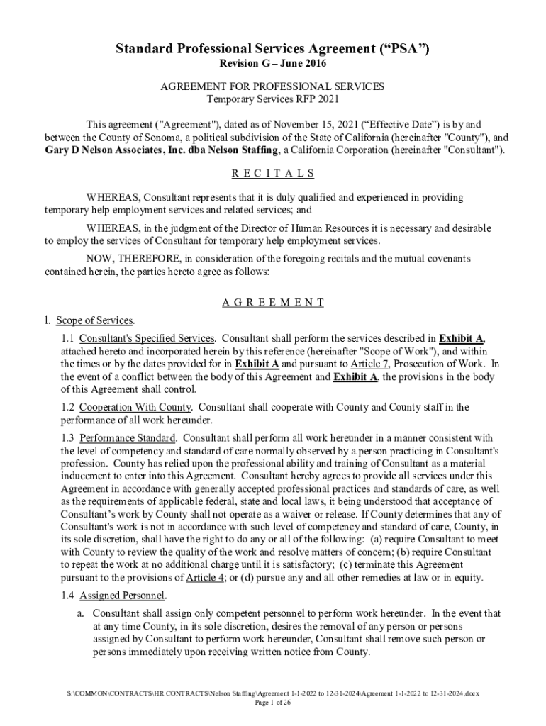 Standard Professional Services Agreement (PSA) Revision G June 2016AGREEMENT FOR PROFESSIONAL SERVICES Temporary Services RFP 2021 This agreement (\” Agreement\”), dated as of November 15, 2021