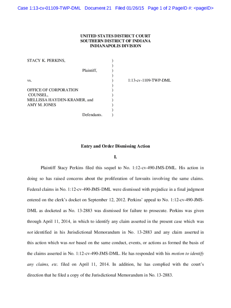 Get the free Entry and Order Dismissing Action I. Plaintiff Stacy Perkins filed this ...