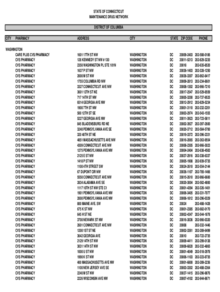 STATE OF CONNECTICUT MAINTENANCE DRUG NETWORK DISTRICT OF COLUMBIA CITYPHARMACYWASHINGTON CARE PLUS CVS/PHARMACY CVS